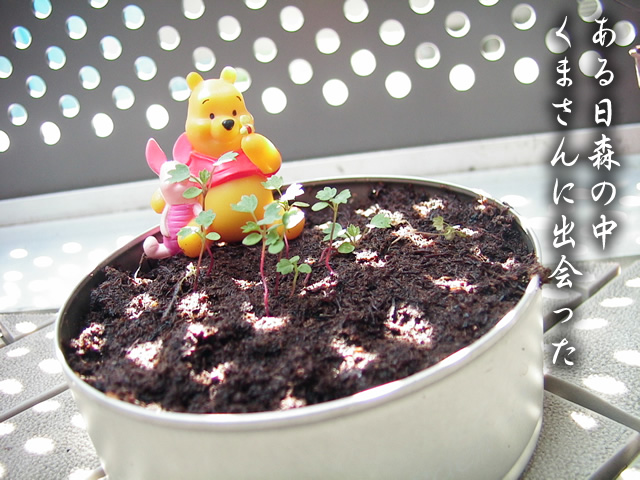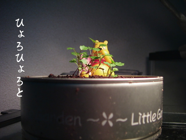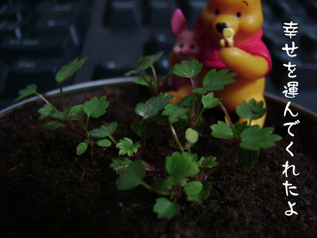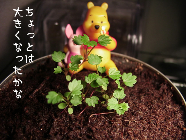 地道に成長してたりします。 葉っぱはやっと、本葉4枚双葉2枚の6枚モードです。 茎もまだまだか細いですね。赤くはなってきてますが。 かじると甘いのでしょうか? 端っこの方の芽は枯れてしまったので、今は真ん中に寄ってる感じ。 植え替えられるのはいつのことやら。。。 |