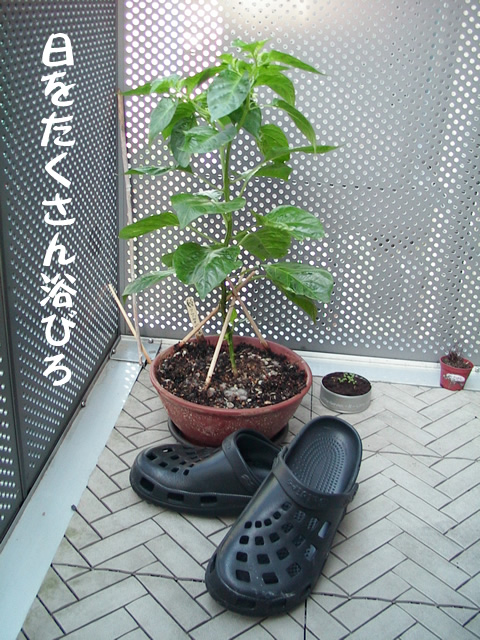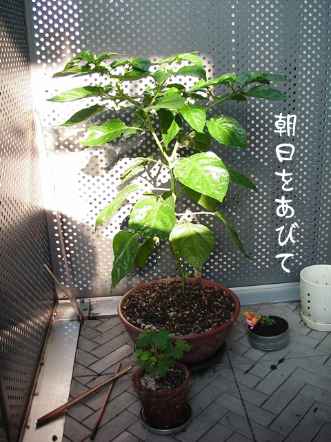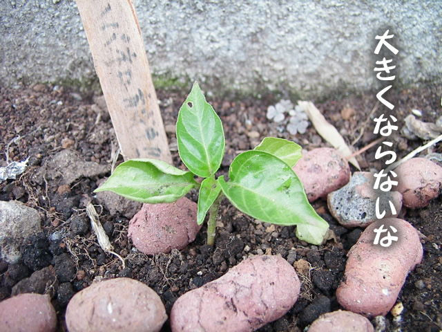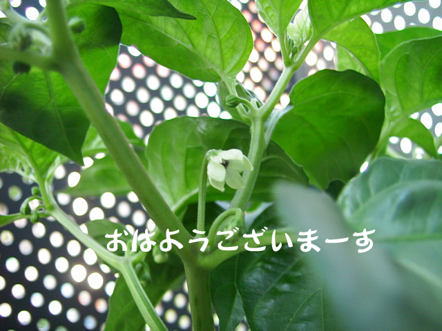 我 現珍的 電脳日誌. 最近様子的 激辛唐辛子. 結構的 育成順調. 我 疑問的 結実 初秋 大丈夫? 感激! 花咲爺的 小花 咲咲咲. 蟻 運搬的 花粉 何処? 我 使用的 胡散臭薬物. 我 望的 薬物中毒的 激辛唐辛子! 再見! |