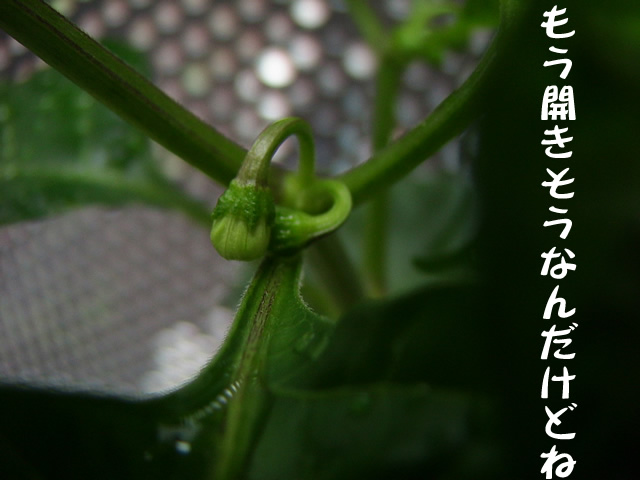このつぼみちゃん。 もう開きそう。 今日仕事から帰ってみるのが楽しみだわ! このくらいのつぼみがあともうひとつアルデスヨ。 猛暑でちぢれてなきゃいいけど。 昨日の雨で曲がってしまったものも、昨日の夜には復活。 これから秋にかけて、花が咲いて、実が成る? 楽しみです。 大事にしていこ。 下のほうの新芽はかわいそうだが、カット。 花が咲いて実をならすのに、余計な養分は使って欲しくないのだ。 |
