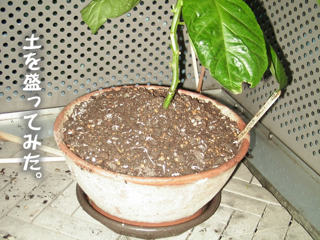 なんだかすぐに雨風で倒れてしまい、自立できないので今まで割り箸とかで支えてましたが、とりあえず、土を盛ることにしました。