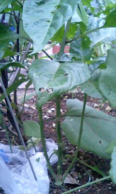 ノブネロ食われまくり・・・なんですけど。。。 昨日ナメクジが1匹いたのを確認しましたが・・・朝起きたら! ひょぉ・・・ナゼコンナニクワレテイルノデスカ? 朝、お父様とお話をしたところ、、、芋虫らしき???のがいたらしい。 なので殺生してくれた、と。 デカイ葉っぱが写っているのは茄子です。。。 茄子でかくなるのが早いよぉ!!! |