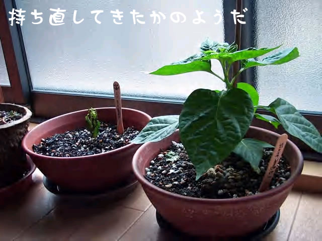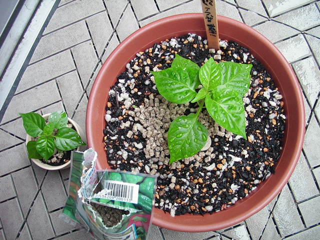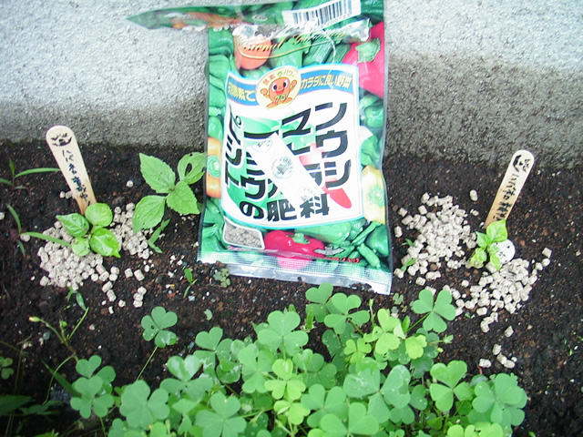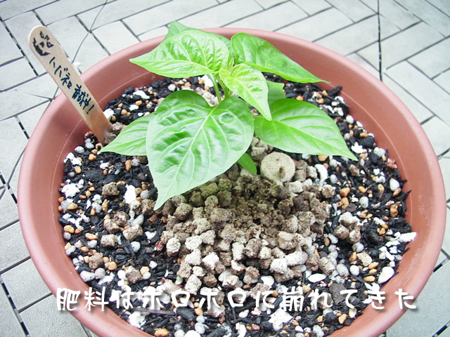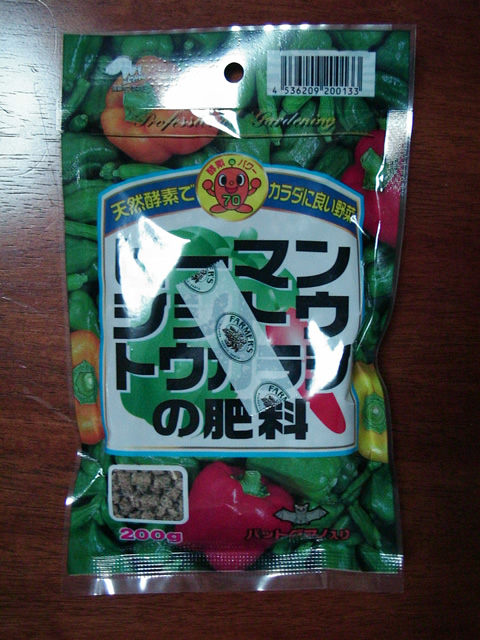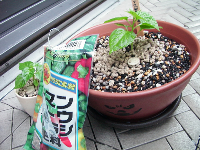 日を追うごとに成長を続けている感じですが、土のパッケージの説明とおり 追肥をやることにします。 買ってきたのはこれ! 「ピーマン シシトウ トウガラシ の肥料」と書いてます。 エムソン肥料と言うところが出してる肥料みたいです。 「バットグアノ」入りらしいです。 バットグアノって何かって? 「フィリピン諸島の洞窟に堆積したコウモリの糞が地下水によって 長い年月をかけて化石化したもの」 らしい なんか分からんけど効きそう! 値段は近所のガーデニングショップで158円。 安いね。 育て方も載っていて、まず元肥として混ぜ込んで使うそうな。 でも、植替えの時使った土がなにやらたくさん肥料を含んでいるので これはパス。 一握りを二箇所に施すとあるのでそれからやってみることにしました。 商品のネーミングからして、これしかない! って感じがします。。。 うーん。説明書の雰囲気と少し違うけどこんな感じでいいのでしょうか? サブの方は、一握りもあげてしまうとあふれてしまうので、キモチ程度で。 これ、上から見た写真。 昨日よりもでかくなってます。 一回りはでかいね。 葉っぱも10枚に! まだまだ新芽も出てきています。 種の威力が違ったのかな。やっぱり成長は遅いです。 でもここまで持ち直してくれてうれしいだよ! で、花壇の方にも追肥。 肥料やって写真取ってる姿を近所の人に見られたら。。。 まぁいいか。 |